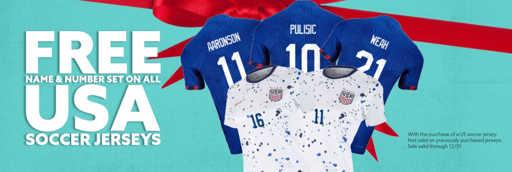 Visit Soccer Pro to get FREE name and number set on all USA soccer Jerseys! Offer valid until 12/31 with the purchase of a US soccer jersey.